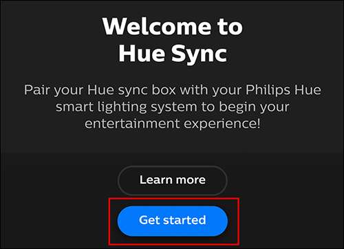 În primul rând, descărcați aplicația Hue Sync pentru dvs. iPhone. , iPad. , Or. Android dispozitiv. Rețineți că acest lucru este diferit de aplicația obișnuită de Hue Philips. Odată ce deschideți aplicația pentru prima dată, veți fi întâmpinați cu un ecran de întâmpinare. Selectați "Începeți."