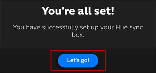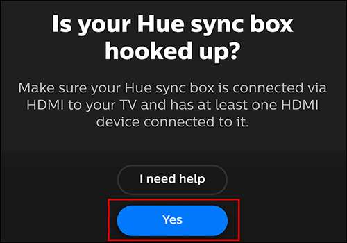 Aplicația vă va întreba dacă este configurată caseta de sincronizare a Hue. Pentru a face acest lucru, conectați pur și simplu caseta de sincronizare la putere, asigurați-vă că toate intrările HDMI pe care doriți să le utilizați sunt conectate și asigurați-vă că caseta de sincronizare este apoi conectată la televizor prin HDMI. Odată ce ați terminat, atingeți "Da".