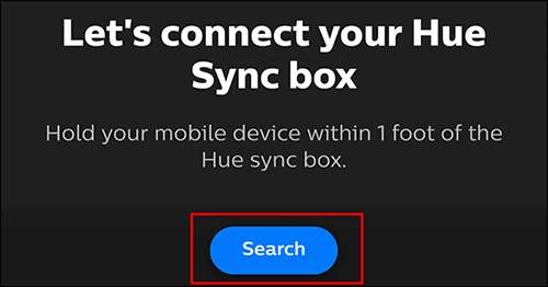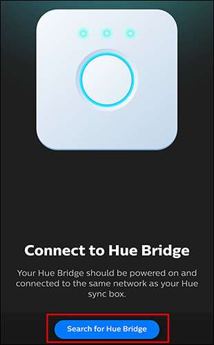 Apoi, va trebui să conectăm caseta de sincronizare a Hue la podul Hue. Asta e ușor. Selectați "Căutați podul Hue."