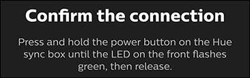 Apoi, vi se va solicita să confirmați conexiunea. Țineți apăsat butonul de alimentare de pe partea frontală a casetei de sincronizare până când LED-ul de pe partea frontală clipește verde și apoi eliberați.