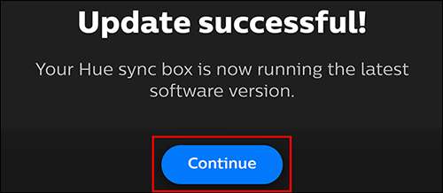 Apoi va verifica automat actualizările și va actualiza dacă este necesar. În timp ce actualizarea instalează, caseta de sincronizare poate reporni. Odată terminat, vă va informa că actualizarea a avut succes. Selectați "Continuați."