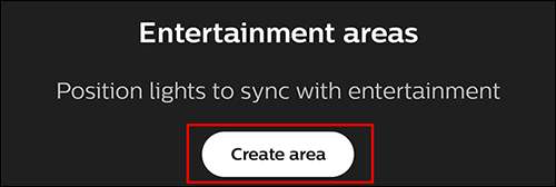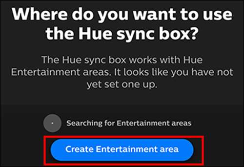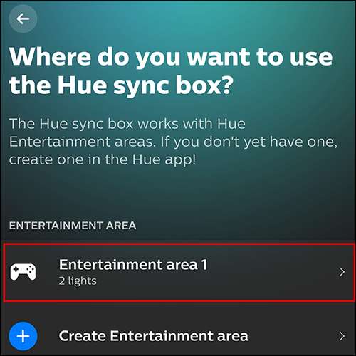 Apoi, aplicația vă va întreba ce spațiu sau zona de divertisment doriți să setați caseta de sincronizare. Dacă aveți o zonă de divertisment deja înființată în aplicația Philips Hue, pur și simplu o selectați. Dacă nu, apăsați "Creați zona de divertisment".