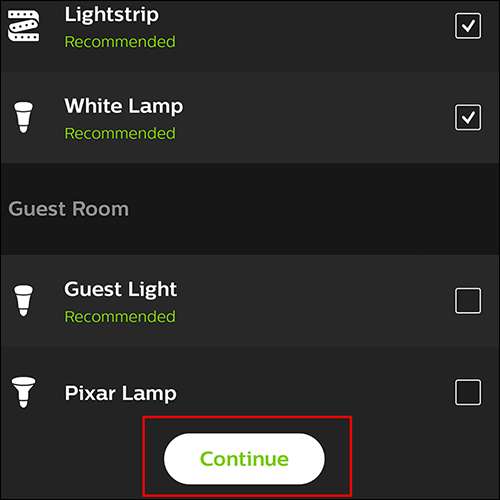 Selectați luminile pe care doriți să le utilizați în zona de divertisment - numai luminile capabile de culoare vor apărea aici. Odată ce ați selectat luminile, atingeți "Continuați".