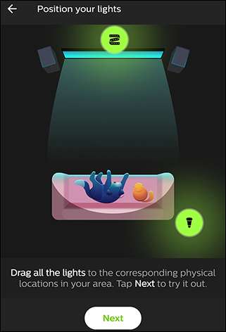 Determinați poziția în care vor fi amplasate luminile. Atingeți și trageți luminile în zonele corecte din camera dvs. Pentru acest exemplu, mi-am poziționat Philips Hue Lightstrip în spatele televizorului meu și la lampa mea în dreapta canapelei mele. După ce ați terminat, atingeți "Următorul".