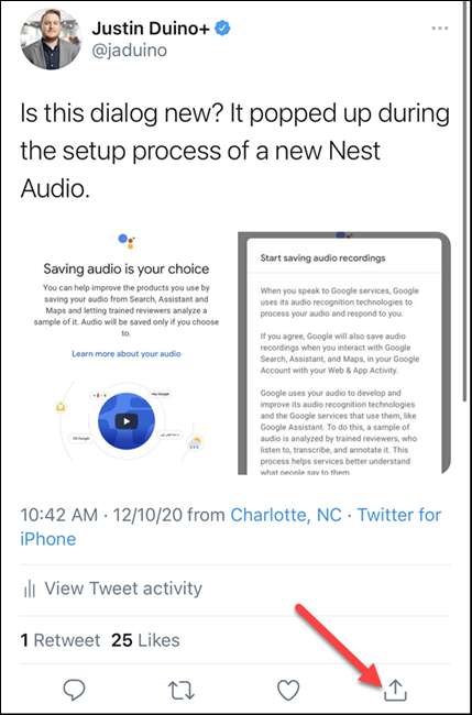 Pentru a începe, deschideți Twitter, găsiți Tweet pe care doriți să îl partajați, apoi atingeți pictograma Share sub ea.