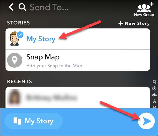 Selectați "Povestea mea" din ecranul de partajare, alegeți orice alt prieten pe care doriți să îl trimiteți, apoi atingeți săgeata.