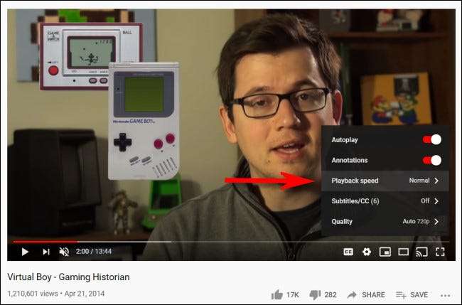 YouTube include o caracteristică numită "viteză de redare" care vă permite să selectați o viteză oriunde între 0,25 ori și 2 ori viteza normală. Cu o viteză normală "1", "0,25" este egală cu un sfert din viteza inițială (încetinirea redării în jos) și "2" este de două ori mai rapidă ca normal.