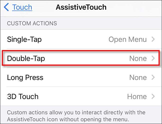 În timp ce vă aflați în setările de asistență, puteți experimenta o modalitate de a declanșa o captură de ecran utilizând accesul la asistență. Derulați în jos în jos și localizați secțiunea "Acțiuni personalizate". Aici puteți alege ceea ce se întâmplă dacă atingeți un singur atingere, apăsați lung, apăsați lung sau 3D-touch (în funcție de modelul iPhone) butonul de asistare de onScreen.