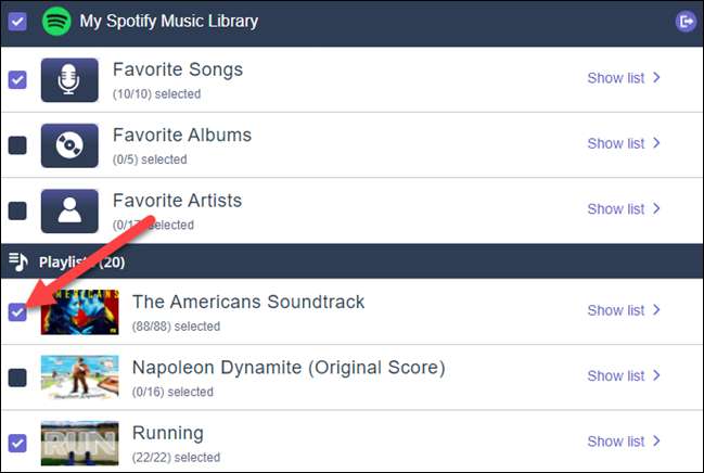 Dacă încărcați melodii din contul dvs., veți fi întâmpinați cu o listă a playlisturilor salvate. Selectați toate listele de redare pe care doriți să le mutați la muzica Apple. Puteți face clic pe "Afișați lista" pentru a selecta sau deselecta melodiile individuale.