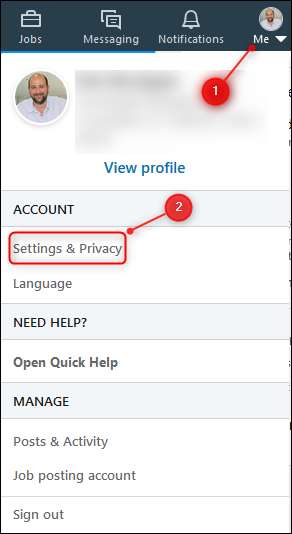 Faceți clic pe avatarul dvs. în colțul din dreapta sus al Site-ul LinkedIn . În meniul care se deschide, faceți clic pe opțiunea „Setări și confidențialitate”.