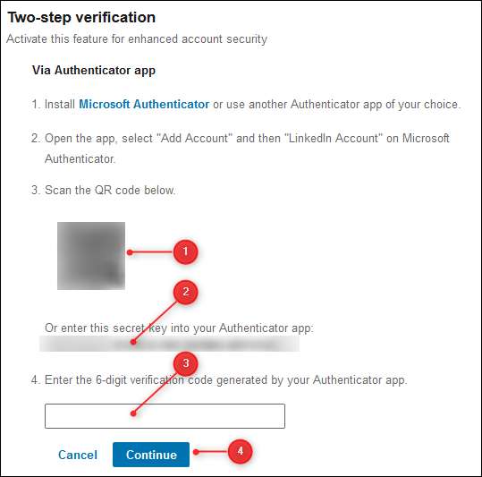 Sunt afișate instrucțiunile pentru adăugarea unui cont în aplicația dvs. de autentificare. Adăugați un cont nou în aplicația dvs. de autentificare, scanați codul QR folosind camera telefonului și, odată ce contul este creat, introduceți codul din șase cifre din aplicația de autentificare în caseta de text din LinkedIn și faceți clic pe „Continuați”.