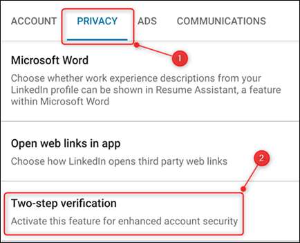 Deschideți fila „Confidențialitate”, derulați în jos, apoi atingeți „Verificare în doi pași”.