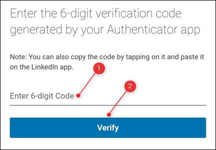 Introduceți codul din șase cifre din aplicația de autentificare în caseta de text din LinkedIn și atingeți „Verificați”.
