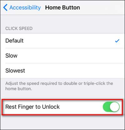 În meniul Buton de pornire veți găsi o intrare, dezactivată în mod implicit în iOS 10, etichetată „Rest Deget pentru deblocare”. Activați-l, așa cum se vede mai jos.