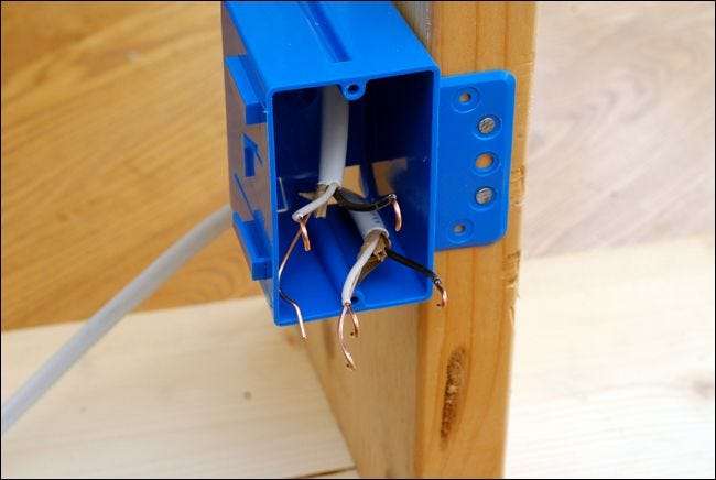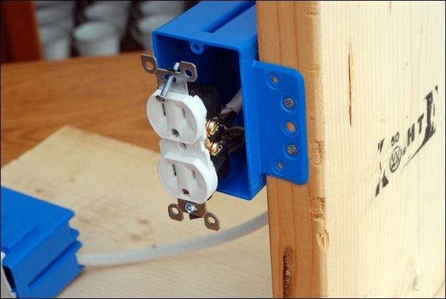 În sensul acestui articol, am construit o configurație de cablare electrică falsă (dar funcțională) folosind câteva resturi de lemn și componente electrice de bază, văzute mai sus. Această configurație este identică cu ceea ce ați găsi într-o casă modernă (fără gips-carton, desigur).