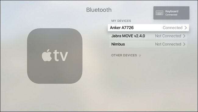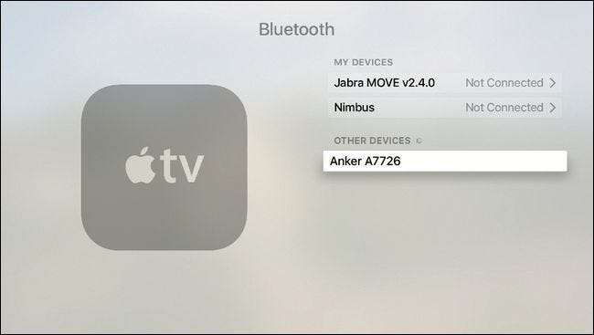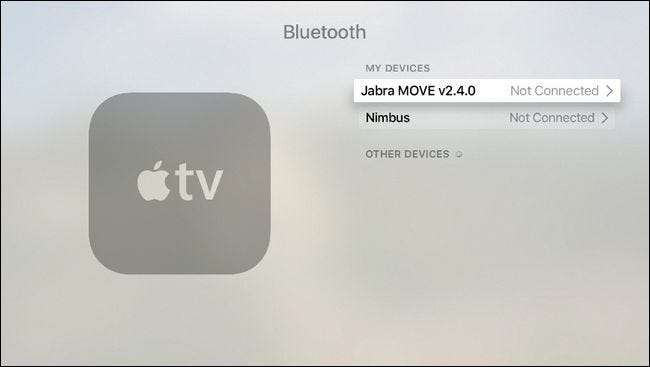 Aici veți găsi orice dispozitiv Bluetooth asociat anterior. Deși Apple TV nu a fost livrat cu suport pentru tastatură Bluetooth, a fost livrat cu suport pentru Căști Bluetooth și Controlere de joc Bluetooth . (Serios, este absurd faptul că nu a acceptat tastaturile împreună cu celelalte periferice.)