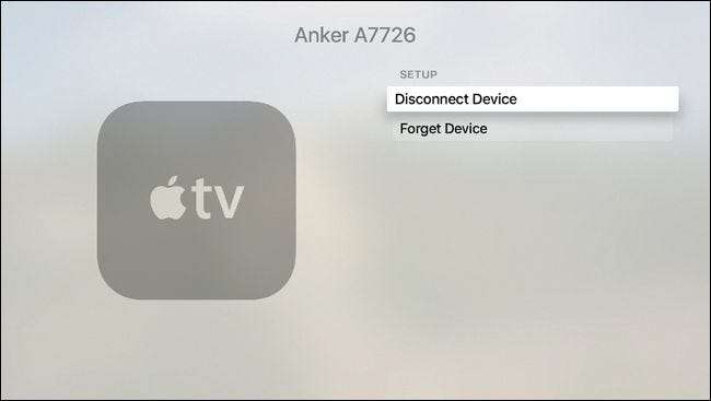Puteți selecta dispozitivul din listă, dar opțiunile din acesta sunt destul de limitate: puteți deconecta manual dispozitivul sau puteți uita dispozitivul pentru al scoate din lista de dispozitive asociate a Apple TV. Practic vorbind, singurul motiv pentru care ați intra vreodată aici este să despărțiți definitiv dispozitivul, întrucât simpla oprire a dispozitivului îl va deconecta.