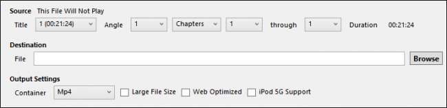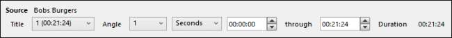 Sub aceste butoane sunt caracteristicile Sursă și Destinație. Destinația, desigur, vă permite să alegeți unde este salvat fișierul convertit și cum se numește. Sursa afișează informații de bază despre fișierul sursă: titluri în fișier, unghiuri și butoane derulante care vă vor permite să convertiți fișierul în funcție de capitol, timp (secunde) sau cadre.