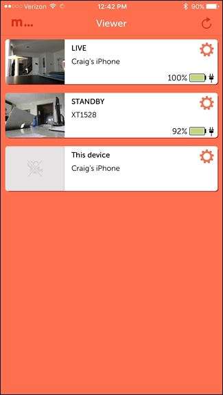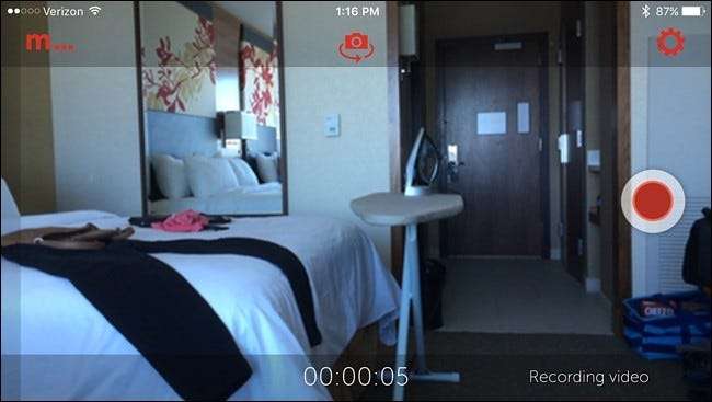 După aceea, interfața camerei va apărea. Puteți începe imediat apăsând butonul roșu de înregistrare pentru a începe să vă monitorizați casa. De aici, puteți să vă sprijiniți smartphone-ul împotriva unui fel de margine sau să obțineți un trepied mic și un suport pentru telefon. Ceva de genul Joby GripTight Micro Stand ar fi perfect. De asemenea, va trebui să vă asigurați că telefonul este conectat la o sursă de alimentare, astfel încât bateria să nu moară în timpul zilei.