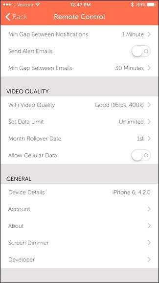 Multe lucruri pot transmite în flux și înregistra prin intermediul unei conexiuni celulare, dar, în general, este o idee bună să păstrați „Permite date celulare” dezactivat, astfel încât să nu treceți prin alocația lunară de date. Cu toate acestea, puteți vedea în continuare fluxul live și înregistrările de pe telefonul vizualizator printr-o conexiune celulară.