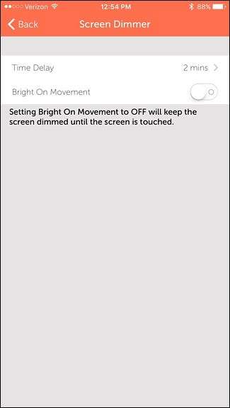 În cele din urmă, atingeți „Screen Dimmer” și asigurați-vă că „Bright On Movement” este dezactivat. Acest lucru asigură faptul că ecranul telefonului care face înregistrarea și monitorizarea nu se aprinde atunci când detectează mișcarea. Nu este o afacere uriașă, dar este o modalitate rapidă de a economisi energie.