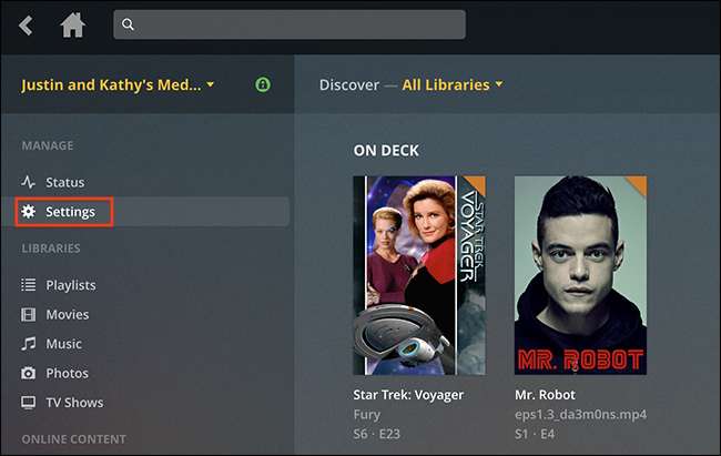 Antena dvs. este conectată la serverul dvs. Plex, dar o puteți configura de pe orice computer care rulează Plex Media Player în modul fereastră sau în timp ce utilizați interfața web. Faceți clic pe opțiunea „Setări” din panoul din stânga.