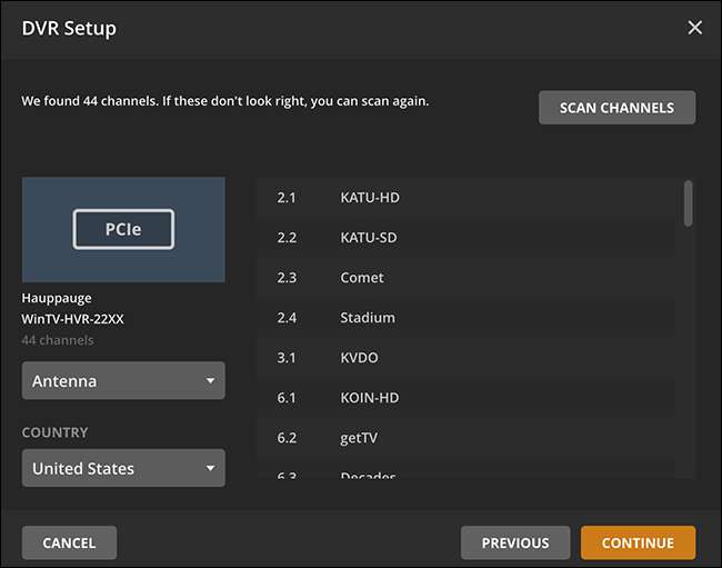 Vi se vor afișa toate tunerele TV compatibile; faceți clic pe al dvs., apoi faceți clic pe „Continuați” pentru a căuta canale. Scanarea poate dura ceva timp, deci aveți răbdare. Veți vedea o listă de canale după finalizarea scanării. Faceți clic pe „Continuați” pentru a merge mai departe.