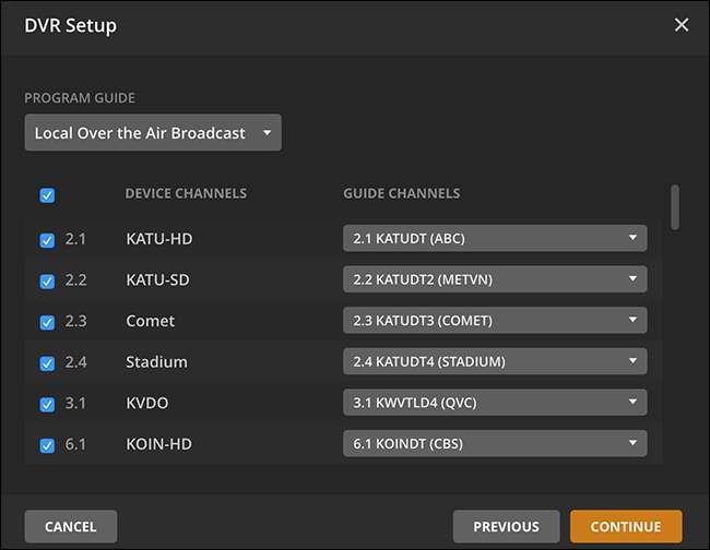Aici vă puteți asigura că fiecare canal este corect aliniat cu o sursă pentru listări de canale. De asemenea, puteți alege ce canale doriți să fie afișate în ghid. Nu vă plac canalele de cumpărături la domiciliu? Nu vă interesează canalele religioase sau vorbitoare de spaniolă? Dezactivați orice canale nu doriți, apoi faceți clic pe „Continuați” când ați terminat. Puteți reveni oricând și puteți schimba lucrurile mai târziu.