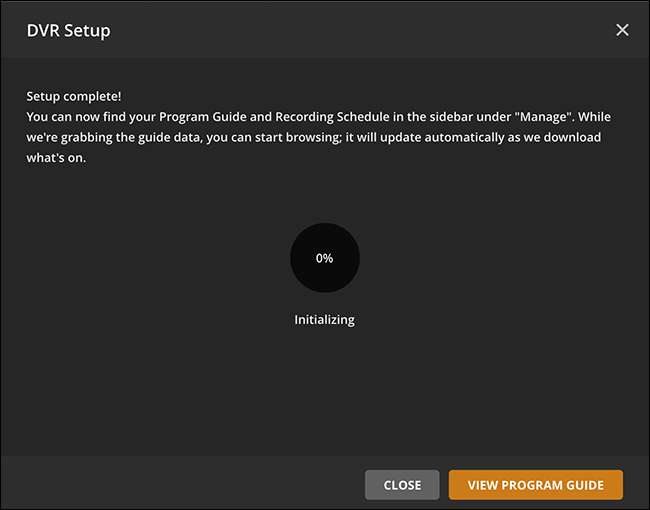 Plex vă va inițializa ghidul și vă va configura totul. Puteți continua și închide fereastra sau vă puteți îndrepta spre ghidul de programe. Plex va continua inițializarea în fundal. Rețineți că ghidul de programe nu va avea setul complet de date până la finalizarea inițializării.