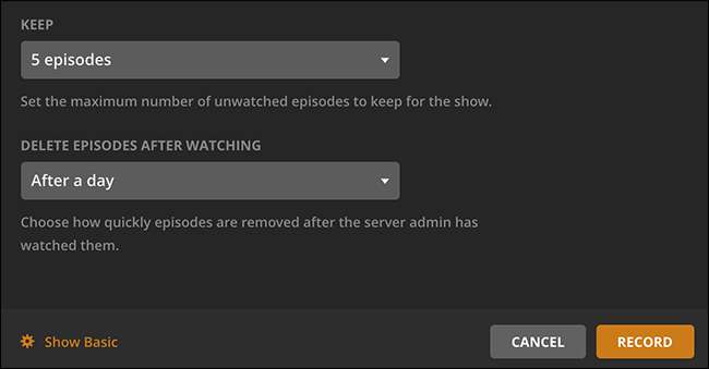 Puteți înregistra un singur episod al unei emisiuni, fiecare episod sau doar difuzări noi (ceea ce înseamnă aici orice episod pe care nu l-ați înregistrat deja). De asemenea, puteți configura când episoadele sunt șterse automat în panoul de setări „Avansat”.