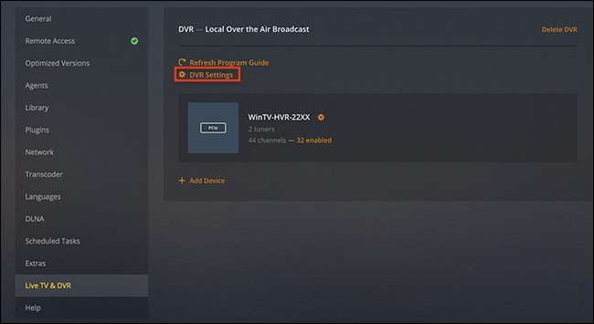 Plex acceptă, de asemenea, eliminarea automată a reclamelor din înregistrările dvs. Acest lucru se face folosind Comskip, pe care noi a prezentat aici configurarea pentru NextPVR . Totuși, este mult mai ușor să configurați acest lucru cu Plex. Accesați Setări> TV live și DVR, apoi faceți clic pe opțiunea „Setări DVR”.