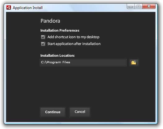 Instalarea este destul de simplă. Veți dori mai întâi să instalați Adobe’s AIR. Am ales să instalez separat aplicațiile AIR și Pandora. Cu toate acestea, ei au un pachet pentru descărcare și instalare împreună.