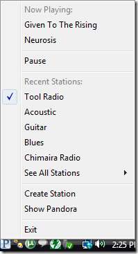 După conectare, veți observa o mică pictogramă Pandora pe bara de activități. Faceți clic dreapta pe pictogramă pentru a obține un meniu pop-up. Acest meniu permite navigarea rapidă a diferitelor stații Pandora pe care le aveți. De asemenea, va arăta ce piesă este redată în prezent.