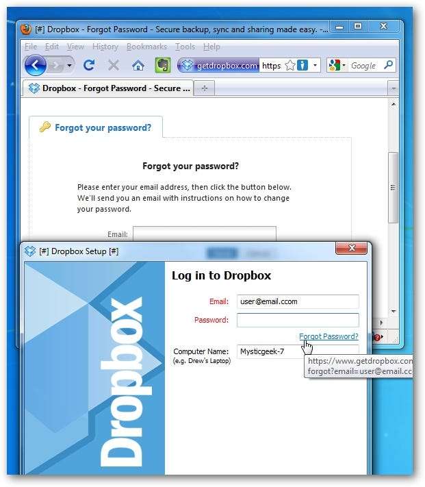 Orice faceți cu o aplicație cu nisip va deschide totul într-un mediu cu nisip. De exemplu, aici rulez DropBox în sandbox. Când faceți clic pe linkul Parolă uitată, acesta deschide Firefox (sau orice alt browser implicit) și în modul sandboxed.