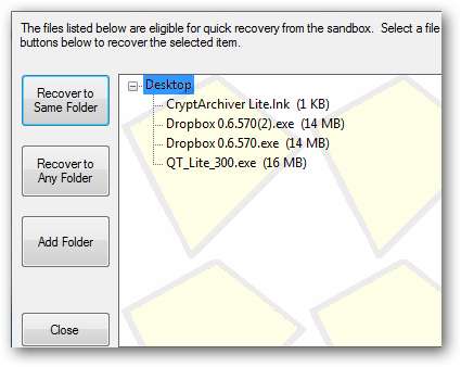 Nu se vor face modificări în sistemul dvs. real, astfel încât după descărcarea unui fișier, va apărea un ecran care vă va întreba dacă doriți să îl recuperați în sistemul dvs. (fișierele sunt salvate în directorul Sandboxie în care îl instalați). După ce te-ai obișnuit cu Sandboxie, poți dezactiva afișarea acestui ecran.