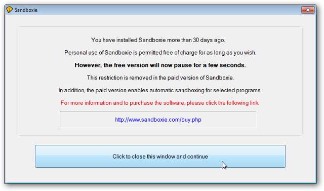 Sandboxie este o aplicație gratuită pentru uz personal, dar după 30 de zile veți primi un ecran de reamintire prin care doriți să cumpărați o licență.