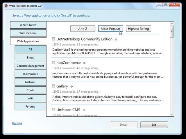Am vrut să instalăm WordPress, așa că, în loc să alegem o presetare, selectăm Aplicații Web fila din stânga. Acum puteți alege dintr-o varietate de aplicații în funcție de categorie sau le puteți vizualiza pe toate împreună într-un De la A la Z , Cel mai popular , sau Cea mai mare evaluare listă.