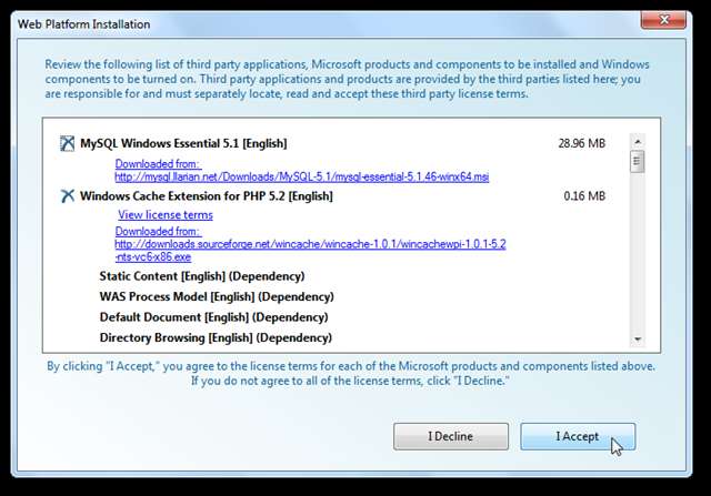 Programul de instalare a platformei web vă va arăta acum tot ce este selectat, inclusiv componentele pe care le-a selectat automat. Observați că am ales doar să instalăm WordPress și Visual Web Developer 2010 Express, dar a selectat automat MySQL și PHP. Clic Accept a inainta, a merge mai departe.