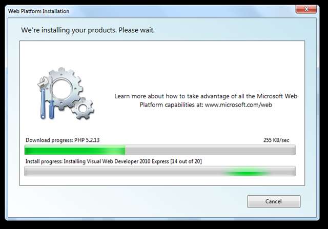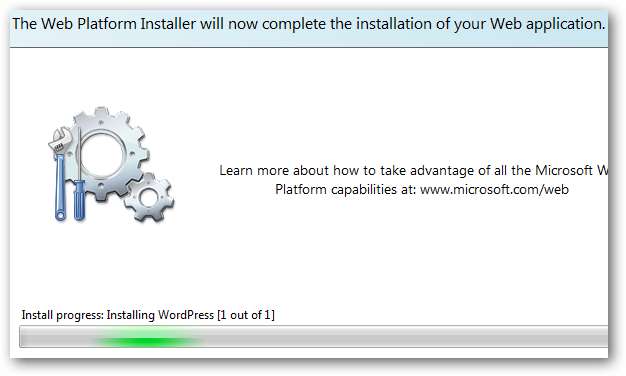 Acum, Web Platform Installer va prelua, descărcând, instalând și configurând automat toate aplicațiile dvs. web. De asemenea, va activa componente Windows opționale care ar putea fi necesare pe computerul dvs. Acest lucru poate dura câteva minute, în funcție de componentele selectate și de viteza dvs. de internet.