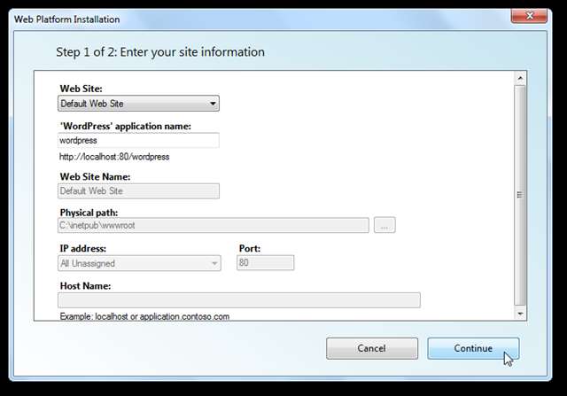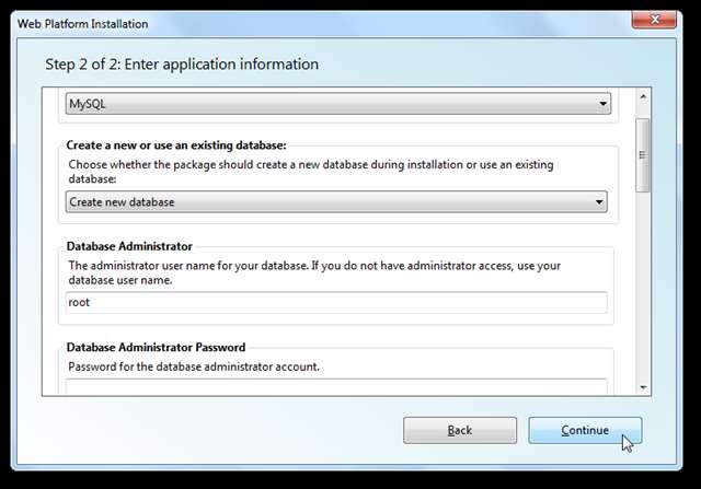 Acum va trebui să introduceți câteva informații pentru aplicațiile dvs. web. Când instalați WordPress, va trebui să alegeți o bază de date și să introduceți nume de utilizator și parole administrative. Este posibil să vi se solicite să introduceți informații suplimentare pentru securitate suplimentară, dar pentru un site de testare numai local nu este necesar. Clic Continua când ai terminat.