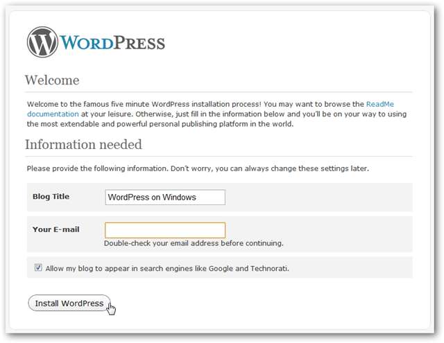 Veți avea doar ceva mai mult de configurat de făcut pe WordPress pentru a-l rula. După ce ați deschis pagina WordPress în browser, introduceți un nume pentru blogul dvs. și adresa dvs. de e-mail și faceți clic pe Instalați WordPress .