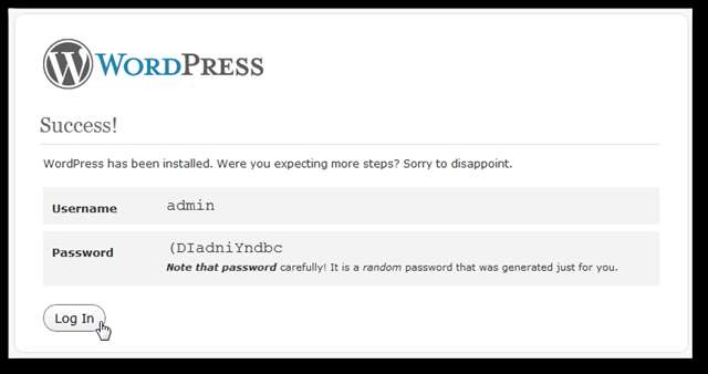 După câteva secunde, ar trebui să vedeți un Succes! pagina cu numele dvs. de utilizator și o parolă temporară. Copiați parola, apoi faceți clic pe Autentificare .