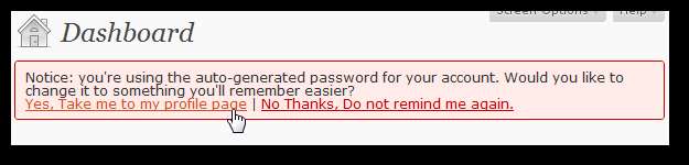 WordPress vă va reaminti să modificați parola implicită. Apasă pe Da, du-mă la pagina mea de profil link pentru a face acest lucru.