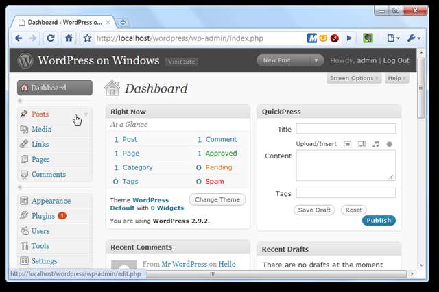 Acum sunteți gata să vă bucurați de noua dvs. instalare WordPress pe Windows. Puteți adăuga pluginuri și teme și orice altceva ați face cu un site WordPress normal. Iată tabloul de bord care rulează de la localhost.