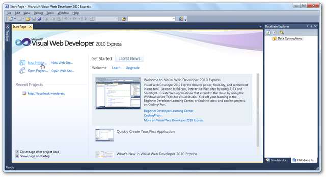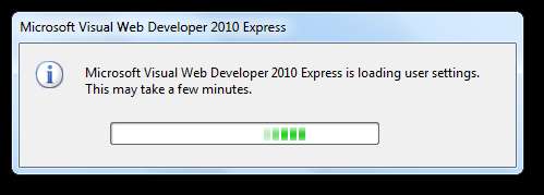 Așa cum am menționat anterior, Visual Web Developer 2010 Express nu s-a instalat corect la prima noastră încercare, ci a doua oară s-a instalat fără probleme. După instalare, lansați-l din meniul de pornire în mod normal. Poate dura câteva minute să se încarce la prima rundă, deoarece se termină configurarea.