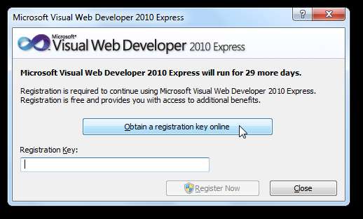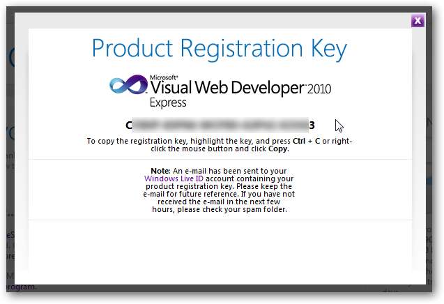 Când ați terminat, copiați cheia de înregistrare afișată și lipiți-o în dialogul de înregistrare din Visual Web Developer.