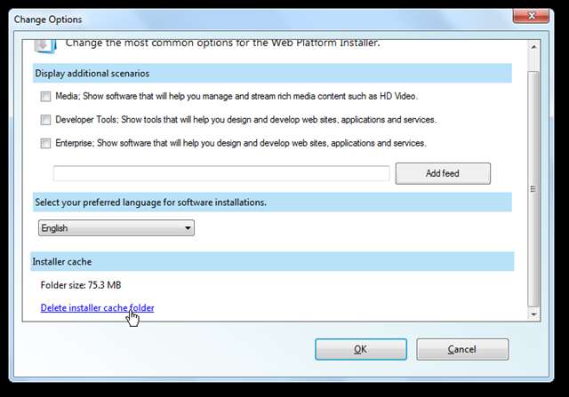 De asemenea, din programul de instalare, puteți curăța fișierele de instalare descărcate în timpul instalării, dacă doriți. Apasă pe Opțiuni faceți legătura în partea de jos a ferestrei, apoi derulați în jos și selectați Ștergeți folderul cache de instalare .