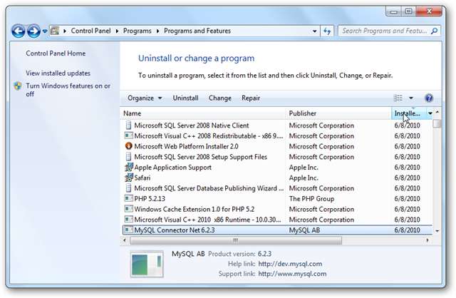 Din păcate, dezinstalarea aplicațiilor nu este la fel de ușoară. Dacă doriți să dezinstalați Web Platform Installer și tot ce ați instalat cu acesta, va trebui să dezinstalați fiecare element individual. O modalitate ușoară de a vedea ce a fost instalat împreună este să sortați intrările Dezinstalați programele după dată. În cazul nostru, am instalat și alte aplicații în aceeași zi, dar este mai ușor să vedeți ce a fost instalat împreună.