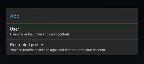 Dacă utilizați Android 4.3, aveți și posibilitatea de a configura profiluri restricționate selectând Profil restricționat atunci când adăugați un cont de utilizator nou.