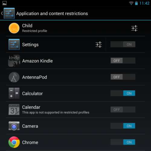 Profilurile restricționate funcționează similar cu controalele parentale. Profilul restricționat are acces la aplicații din contul dvs., dar puteți alege exact la ce aplicații au acces. Dezvoltatorii au opțiunea de a implementa setări fine pentru profiluri restricționate, astfel încât să puteți alege teoretic ce ar putea face profilul restricționat într-o anumită aplicație.